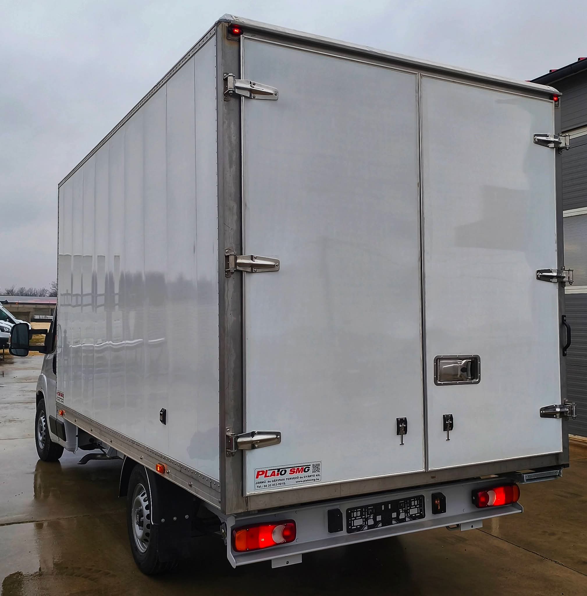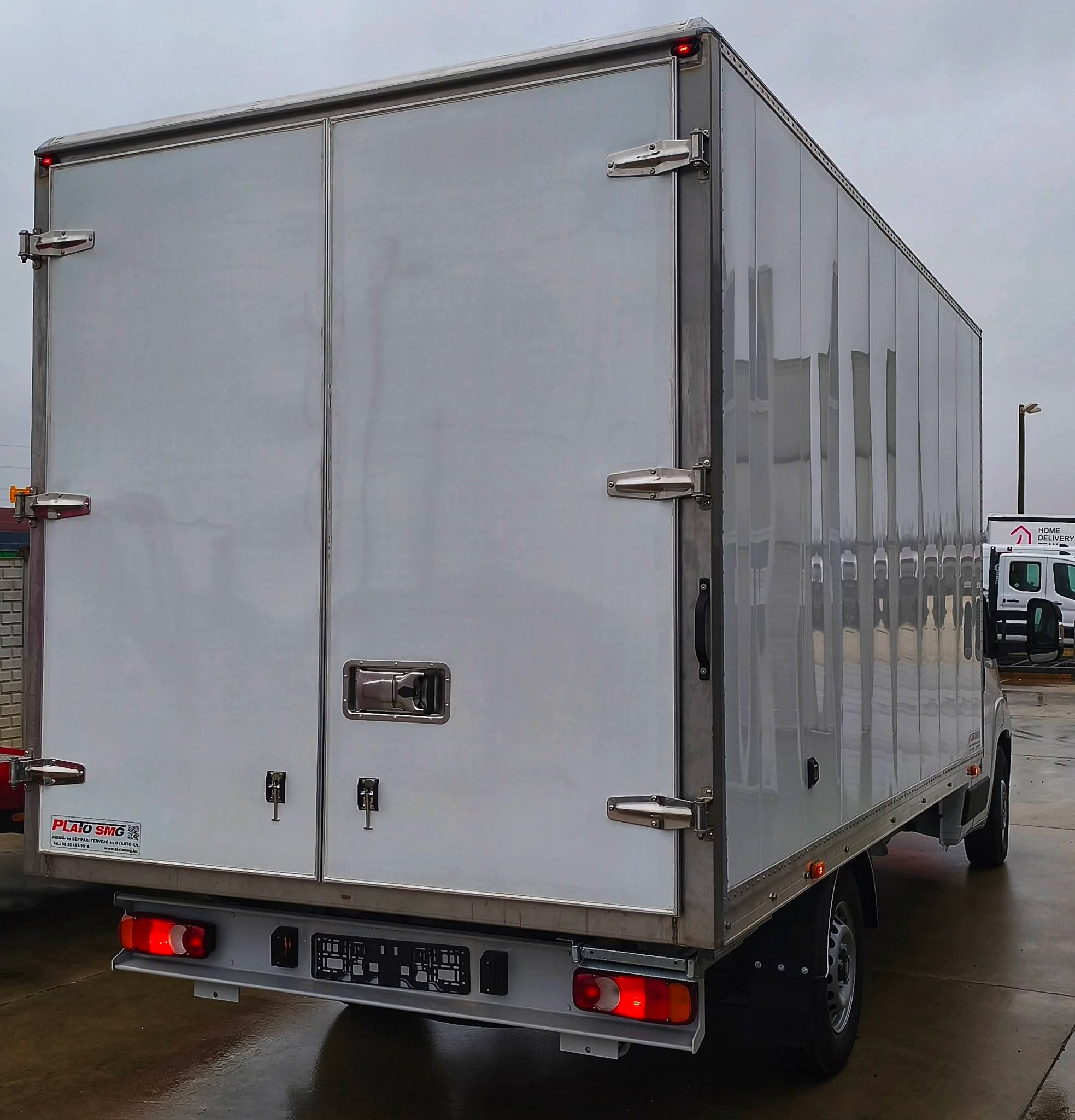 A zárt alumínium dobozfelépítmény megfelelő merevítéssel ellátott alapkivitelben fehér színűre lakkozott alumíniumlemez borítású panelekből készül. Alapfelszereltségben a felépítményt kétszárnyú 270°-ban nyitható hátsó ajtóval, belső világítással és dörzsléccel gyártjuk. Opcióként a felépítmény 900 mm széles oldalajtóval vagy felnyiló oldalfallal is készülhet. Egyedi kialakításként vállaljuk a dobozfelépítmény fel és lefelényiló vagy tolóponyvás oldalfallal történö kialakítását.